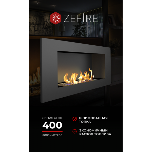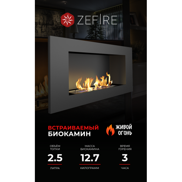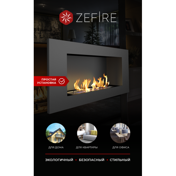 Черный Elliot 900 от российской торговой марки ZeFire – лаконичная и стильная модель встраиваемого настенного биокамина, которая будет одинаково удачно смотреться в современном и классическом интерьере. Такой биокамин не занимает в помещении лишнего пространства, потому подойдет даже для небольших площадей. Его монтаж не требует устройства дымохода или вытяжки и может выполняться без специальных разрешений.