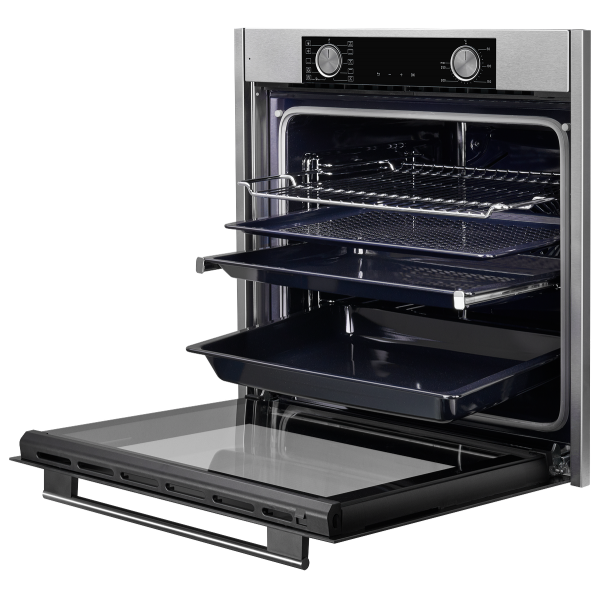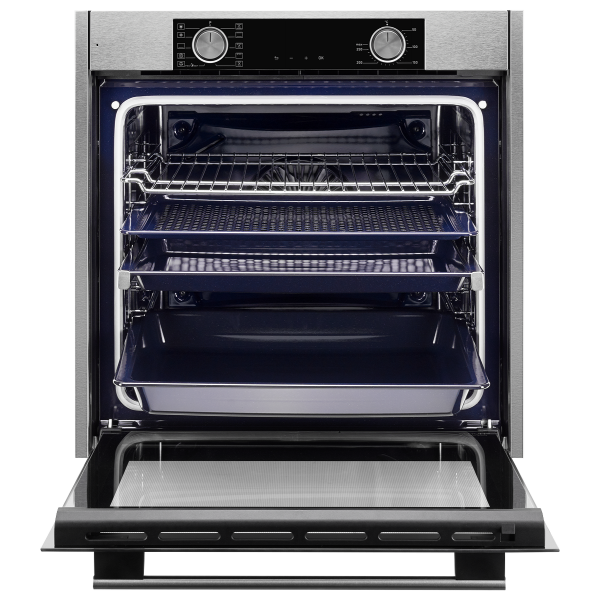 Этот духовой шкаф имеет функцию разморозки и 10 режимов работы, а также поставляется со стандартными и глубокими противнями, решеткой для гриля и перфорированным противнем FryArt. Кроме того, благодаря эмали Crystal Clean, устройство легко чистить с минимальными усилиями.