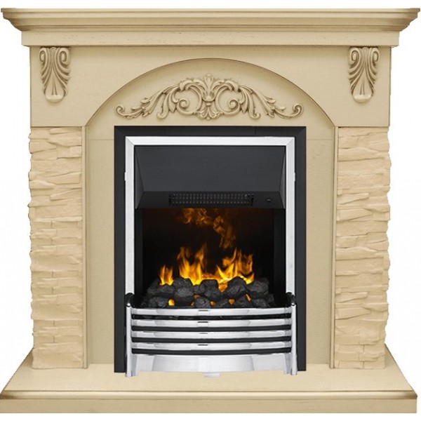 Каминокомплект Bern Сланец крупный бежевый / Алебастр темная патина с очагом Flagstaff