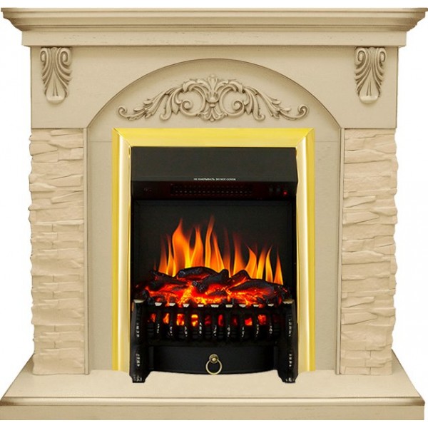 Каминокомплект Bern Сланец крупный бежевый / Алебастр темная патина с очагом Fobos FX Brass