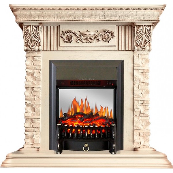 Каминокомплект Luxemburg (каменный) - Сланец/Cлоновая кость с патиной с очагом Fobos FX M Black