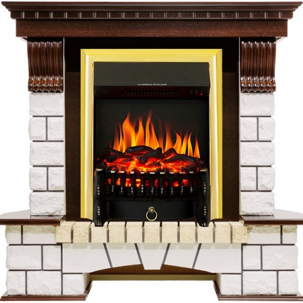 Каминокомплект Pierre Luxe - Темный дуб / Белый с очагом Fobos FX Brass