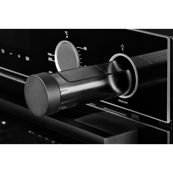 Он также предлагает функцию пароварки, которая позволяет готовить блюда с использованием пара, сохраняя их вкус и полезные свойства. Для удобства приготовления имеется перфорированный противень FryArt, глубокий противень и решетка для гриля, а телескопические направляющие облегчают вынимание горячих противней.