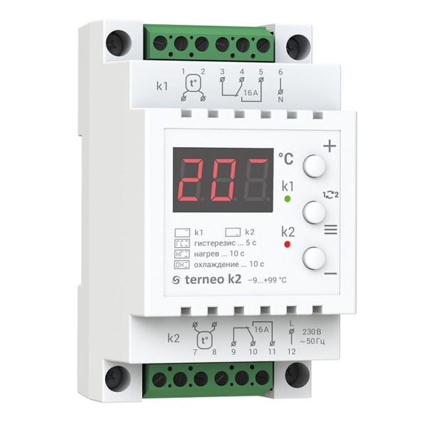 Терморегулятор terneo k2 предназначен для работы с системами «теплый пол» на основе электрического нагревательного кабеля. Особенностью этой модели является возможность применять ее с системами большой номинальной мощности ( 2х3000 ВА). Терморегулятор позволяет поддерживать заданное вами значение температуры от 5 до 40 °С. Данные о температуре поступают от датчика, помещенного в пол.