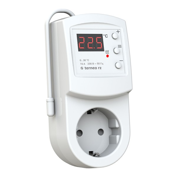 Терморегулятор terneo rz оснащен выносным датчиком температуры воздуха. Контролируйте работу электрообогревателей, инфракрасных панелей, а также систем охлаждения в диапазоне температур от 0 до 30 °С.