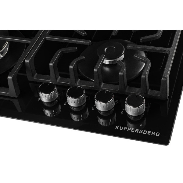 Стильная газовая варочная панель TG 69 B, изготовленная из закаленного стекла черного цвета с черно-серебристой фурнитурой прекрасно впишется в любой проект.